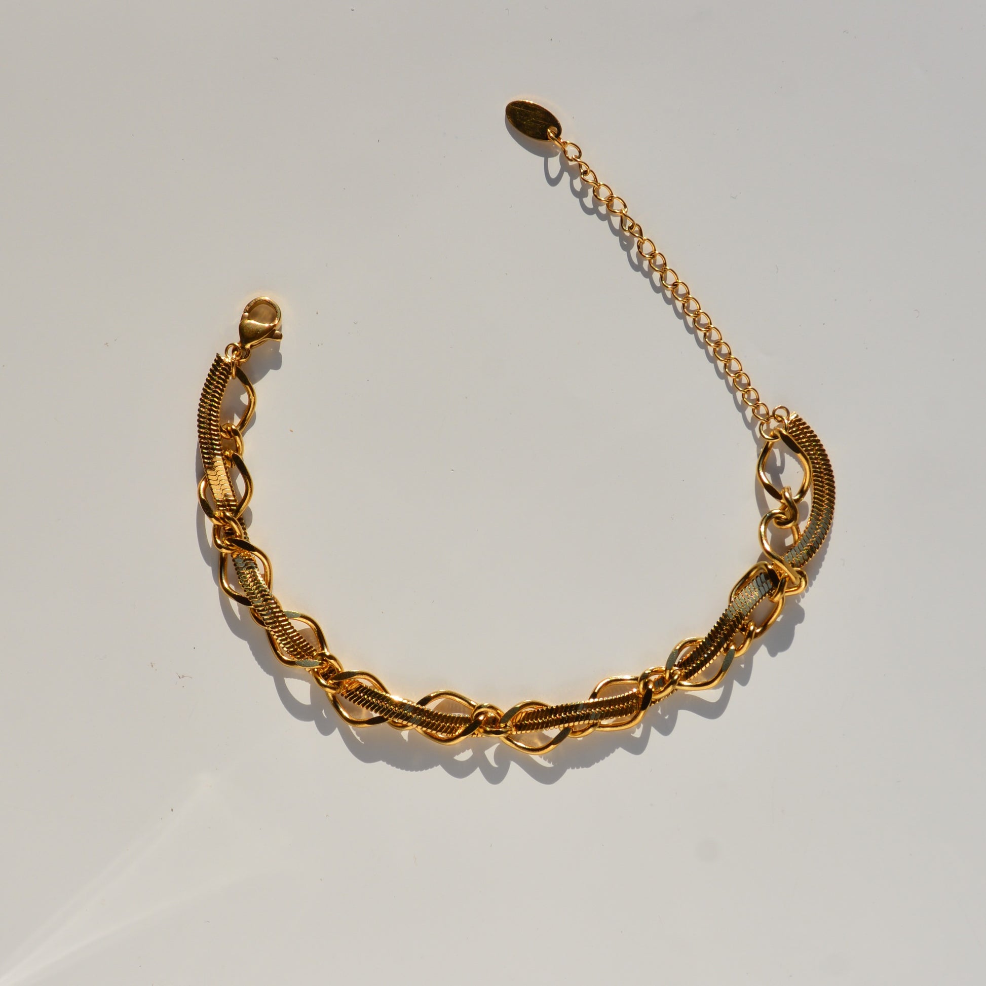 This snake-inspired bracelet features a gracefully curved, serpentine shape that wraps around the wrist, enhanced by an intricately shaped, uniquely styled band running through it. The combination of these two distinct elements creates a striking, multi-dimensional look that exudes sophistication. Crafted from premium stainless steel and finished with opulent gold plating, the Giselle Bracelet is designed to be tarnish-free, waterproof, and hypoallergenic, ensuring lasting beauty and comfort.