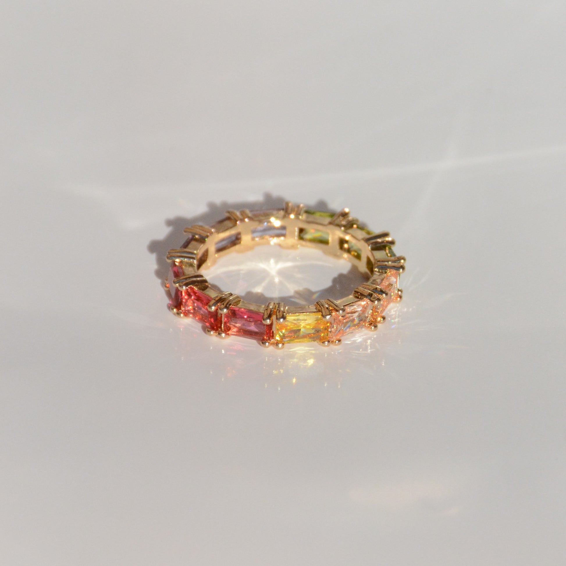 Unveil a spectrum of style with our Mosaic Ring. This eye-catching ring features a captivating ombre of rectangles, each adorned with vibrant hues to mimic the colors of a dazzling rainbow. The dynamic design and play of colors make this ring a bold statement piece, celebrating individuality and joy.